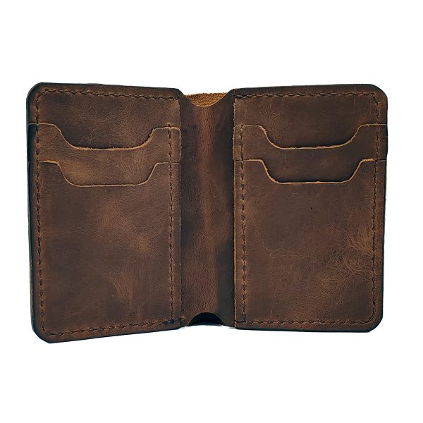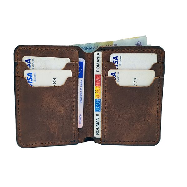 Portofel bărbătesc slim, realizat manual din piele naturală maro de bovină (1-1.2 mm). Design compact, ideal pentru carduri, buletin și bani. Cusut manual cu ață cerată premium pentru rezistență și durabilitate.