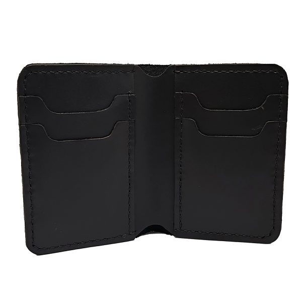 Portofel bărbătesc slim din piele naturală neagră, handmade, cu 8 locuri de card și compartiment pentru bani și buletin. Cusătura manuală cu ață semicerată.