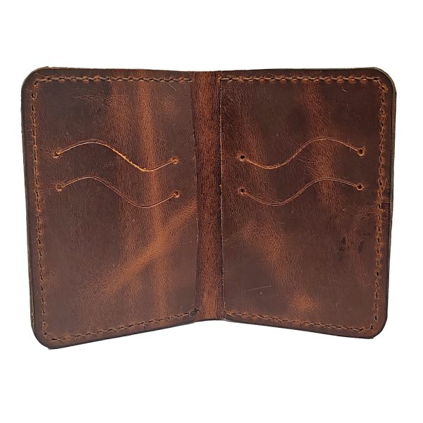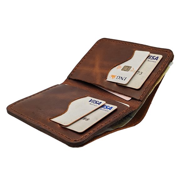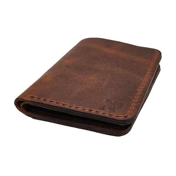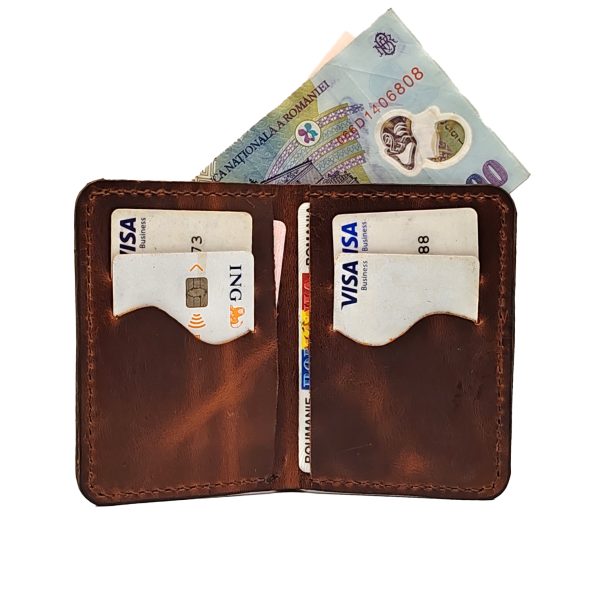 Portofel slim din piele naturală maro, confecționat manual și cusut cu ață semicerată pentru un plus de durabilitate și eleganță. Designul său minimalist, cu tăieturi precise, oferă un aspect modern și funcțional. Dimensiunile compacte îl fac ideal pentru cei care preferă un portofel subțire, dar încăpător.